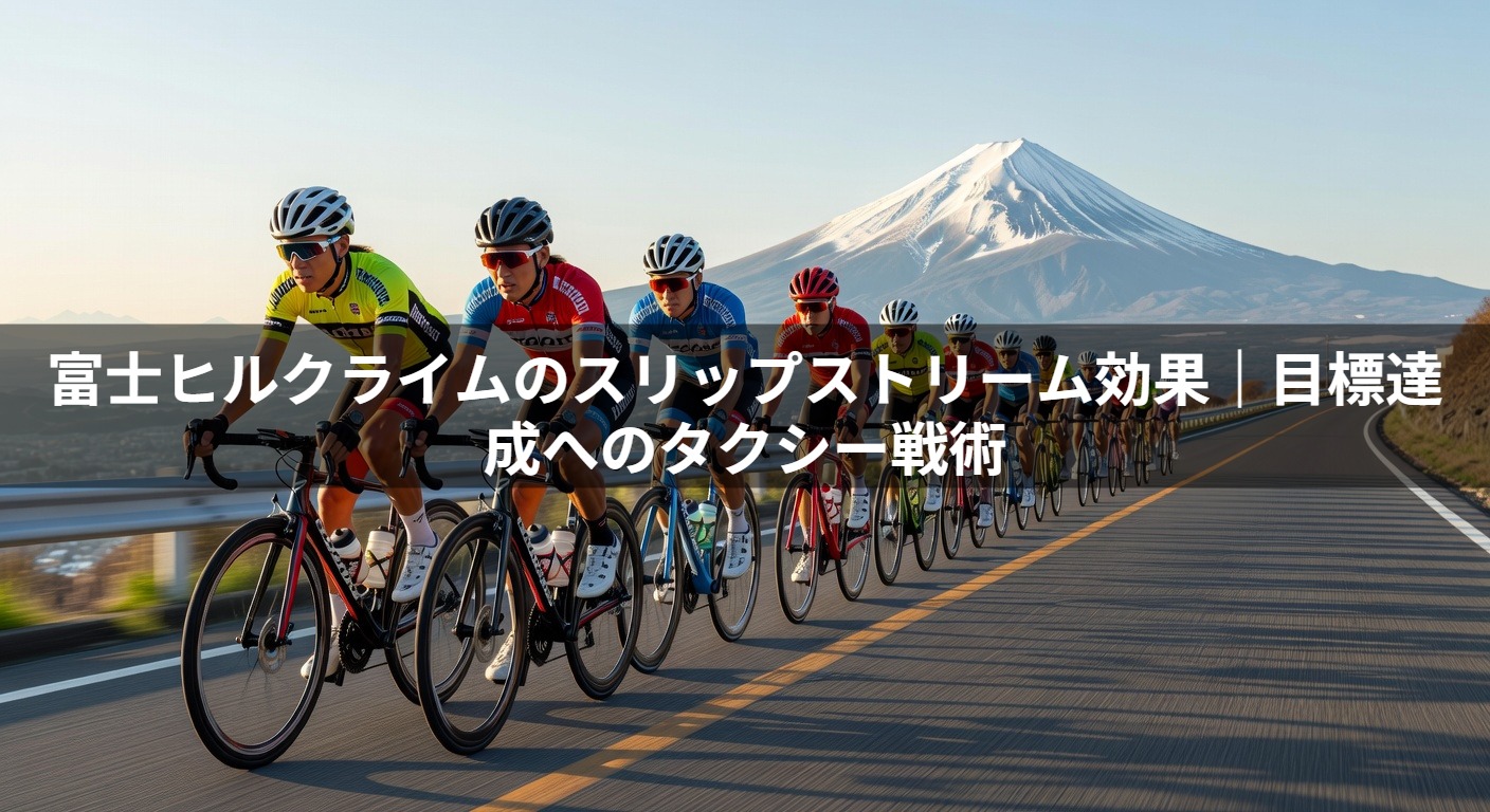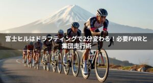富士ヒルにおけるドラフティングの効果は絶大です。同じペースの集団の背後に位置することで、必要な出力を約7%から10%削減できると言われています。これは、5.0W/kg必要な場面を4.6W/kg程度でこなせることを意味します。